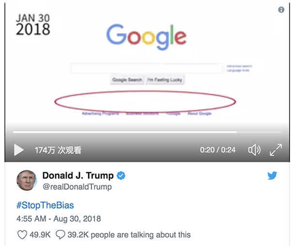 当地时间8月29日,特朗普通过美国社交平台推特发布了一条视频,视频显示美国前总统巴拉克·奥巴马当任期间,谷歌每年都会在其首页上宣传奥巴马的国情咨文演讲,却没有在2017年和2018年一样宣传特朗普的演讲。特朗普为这条推特加上了#停止偏见#的标签,继续指责谷歌的反保守主义倾向。