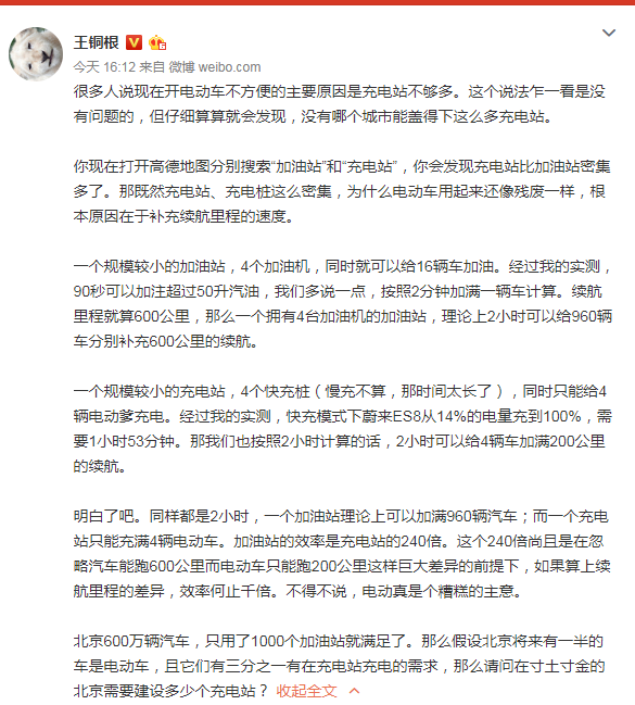 “王铜根”在文中指出,“一个规模较小的加油站,4个加油机,同时就可以给16辆车加油。一个加油站理论上2小时可以加满960辆汽车,而一个充电站只能充满4辆电动车,如果算上续航里程的差异,效率何止千倍”。